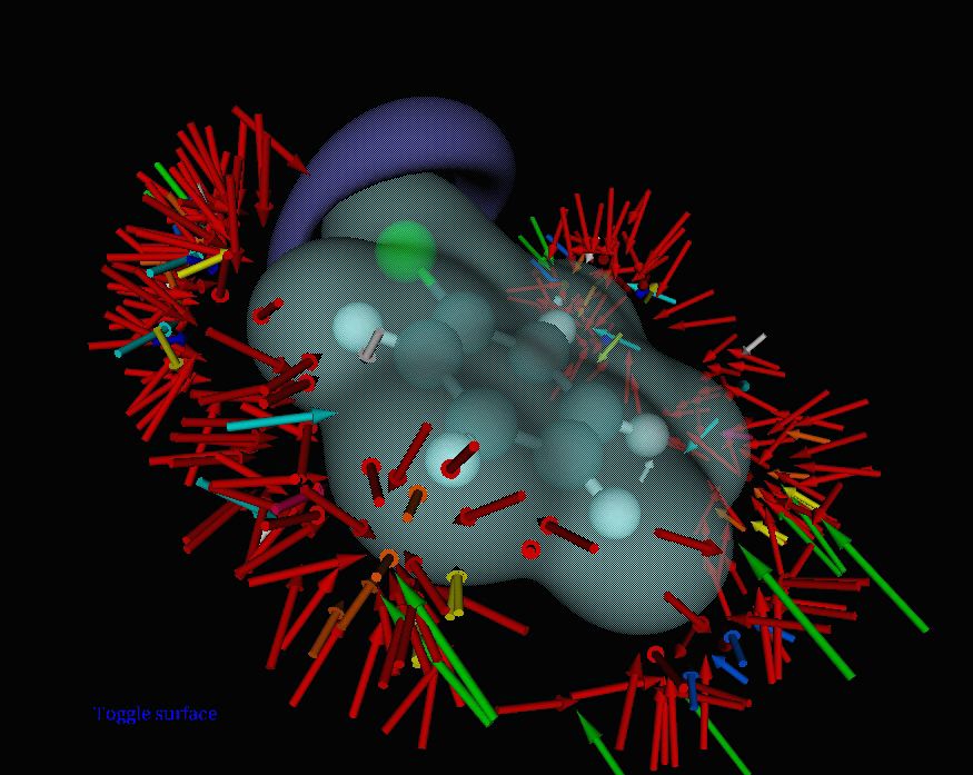 The model shows the results of a search for short contacts of some typical hydrogen bond acceptor groups to a chlorobenzene ring, normalised against the Connolly surface, i.e. that portion of the van der Waals surface that is accessible to a probe of finite radius. Such an approach makes no presuppositions but rather reveals structural preferences, as is borne out by the fact that the vast majority of the contact vectors are oriented towards the ring hydrogens. The conversion to VRML allows for the vectors, colour coded according to the type of contact group, to be hyperlinked to a second model which in turn can be used to highlight the significant interaction, and give other information such as the unit cell and a literature reference. This reference in turn can be a link to the original electronic journal article which allows the research to progress from the discovery of a potentially interesting effect to reading the original article about it.