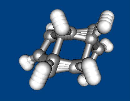Ostensibly, the reaction corresponded to two synchronous electrocyclic ring openings proceeding in a particular manner known as conrotation. Each individual ring opening is, according to a theory first proposed by Woodward and Hoffmann, thermally allowed. From another perspective however, the reaction also corresponded to a cyclo elimination reaction thermally forbidden by the Woodward-Hoffmann rules. How could both interpretations be true? Focusing our eyes on the four atoms corresponding to the cyclo elimination, we realised by watching the animation that the Woodward-Hoffmann forbidden characteristics were in fact avoided by a pronounced lateral dislocation of the two reacting centres (Model 7). If you are reading this article in print, and are having difficulty visualising what we mean by that, we strongly urge you to view the animated VRML model to see how we obtained our original insight.18 |